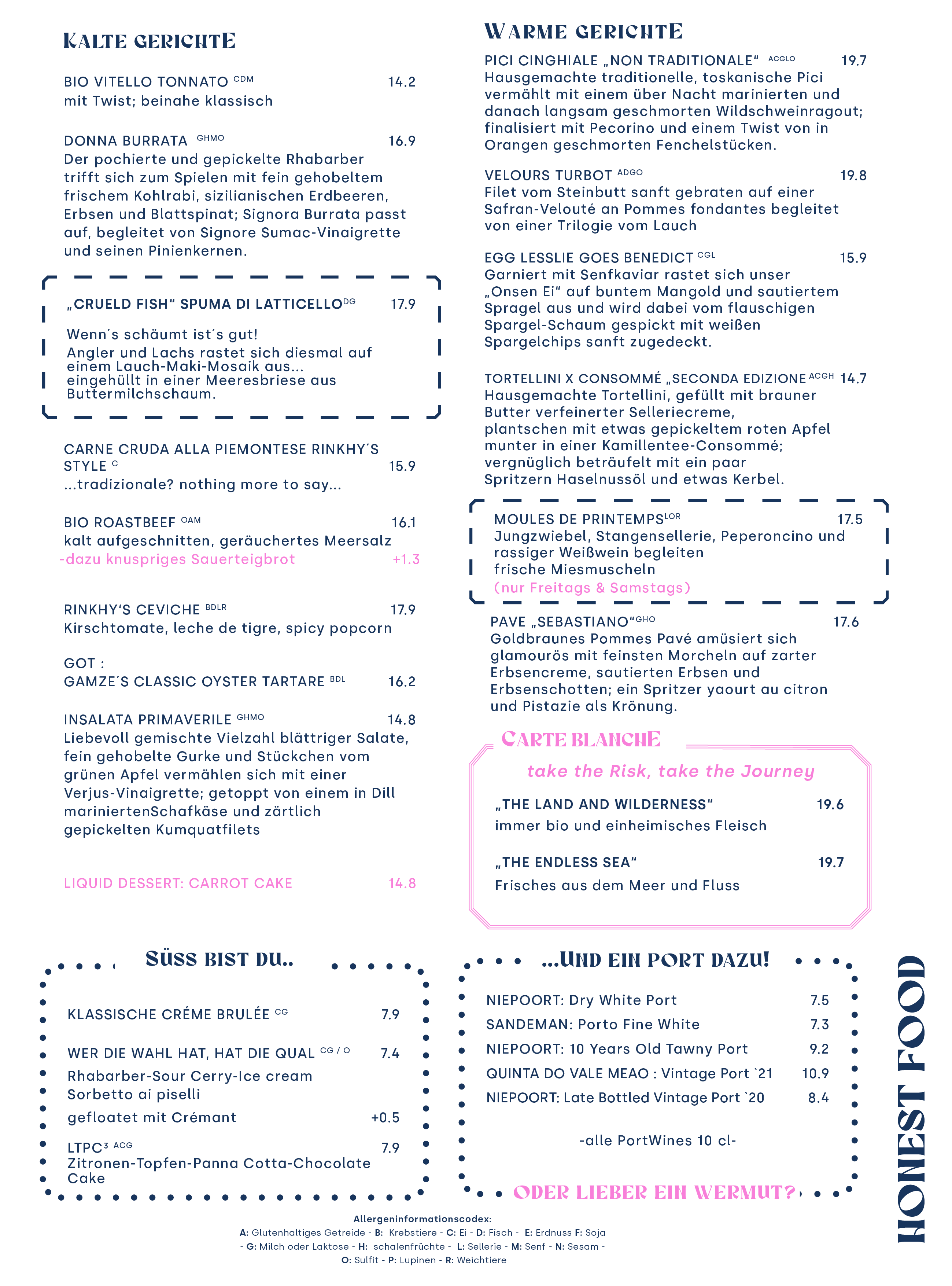 We offer a seasonally-changing, classically-inspired, yet creative menu, ranging from little bites, to warm dishes, to intricate desserts. We carefully source our ingredients from over 30 suppliers, using local, organic products when possible, and trusted, small-scale suppliers within Europe for products that aren't produced within Austria.